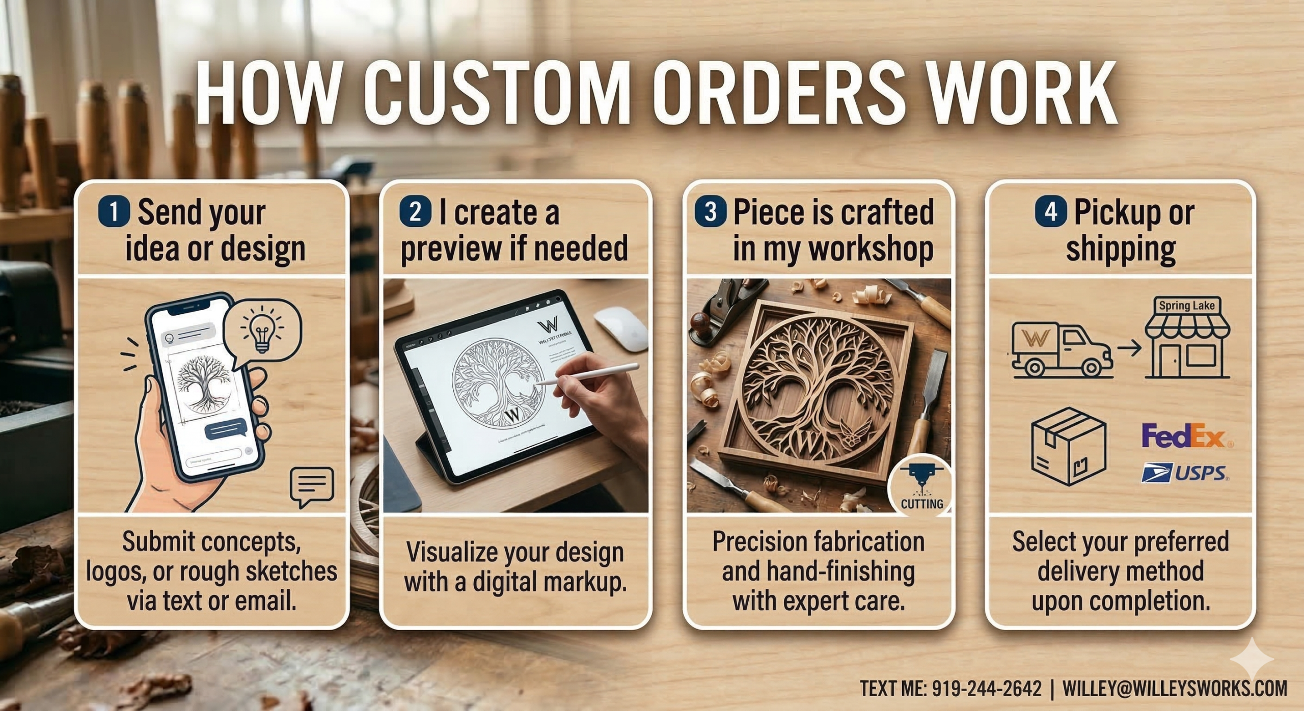 I am currently accepting new commissions. Let’s talk about your design ideas today. Contact me via Text Message below or open the Chat window to message me directly.